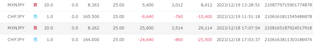 MXN/JPYとCHF/JPYの推移 現状のMXN/JPYとCHF/JPYの異通貨サヤ取りの状況は画像のようになっています。 12/18、12/19にそれぞれ1ペアずつポジションをとっています。12/19のポジションはまだ公表していませんでしたが、どちらも同じような形でとっています。MXN/JPY 20LotChf/JPY 1Lotこの比率でサヤ取りをしている状況ですね。20:1の理由は、MXN/CHFがおおよそ20くらいだからです。MXN/CHFの取り扱いがなく、またサヤ取りの強みを生かすためにも現状のような形で運用しています。 サヤ取りならではの強み 分割でポジションを取ることの強みは、ポジションを立てるときと決済するときのタイミングをずらせる点につきます。レバレッジをかけすぎずに資金に余裕があればの話ではありますが。例えば、わかりやすい円安局面でMXN/JPYのみ建てて、CHF/JPYは高値になってから売りで入るという形ですね。今回は、ほぼ同時のタイミングでポジションを建てましたが、今後は裁量も加えて建てていこうと思います。もちろんリスクもあります。ですが、もしサヤ取りのために良い比率でこの二つの通貨を建てられれば、持っているだけでスワップを増加させつつポジション益も狙えます。CHF/JPYは独特な通貨で、リスク回避用で買いが入ることも多い通貨です。来年は円高になりやすいのですが、状況によって大きく上昇するタイミングがあるという狙いです。 サヤ取りの弱み サヤ取りの弱みは、必要証拠金が増えるということでしょう。MXN/CHFがあれば、証拠金は片方の通貨の分のみで完結します。しかし、サヤ取りで二つの通貨を建てる場合は、それぞれの通貨分の証拠金が必要になります。元金が十分に必要なわけです。また、サヤが広がると損失も大きめに出ます。精神的に耐えられず、利益が出ている方のポジションを決済してしまうということもあるかもしれません。ここは、もう何とか耐えるというしかありません。ポジションを見ず、放置するくらいがちょうどいいでしょう。 今後の予定 今後はサヤ取り用のポジションを分割でとっていくようにします。ここからはテクニカルも入ってくるので複雑ですが、CHF/JPYの暴騰のタイミングになるか、MXN/JPYが暴落したタイミングかと思います。決済した場合も報告をしていこうと思います。こちらは不定期更新になるのですが、気長にお待ちください。また、異業者サヤ取りも行っています。採用している通貨はTRY/JPYです。業者は「サクソバンク証券」と「みんなのFX」です。特にサクソバンク証券のTRY/JPYはスワップポイントが増えやすい時期があります。そちらを狙い、超長期サヤ取りとして行っていきます。 サヤ取り以外のポジ 資金増加のために通常のトレードもしています。メインで行っているのはGBP/USDです。こちらの手法はデイトレ~スイングです。サヤ取りが堅実な投資方法であるなら、GBP/USDのデイトレは積極的な投資ということになります。ポジションを積極的にさらすのはブログでは難しいので、結果報告のような形で淡々としていこうと思います。以下おすすめの証券会社DMM証券……非常に見やすくて使いやすい取引画面が特徴的です。 GBP/USDのキャンペーンを行っているのがJFX証券です。こちら、通貨の取引量によって最大数十万円のキャッシュバックがあり、スプレッドも安いためおすすめです。 サヤ取り用のメイン証券会社に加えて、上記証券会社をカバーしておけばおおよそのことで困ることはないでしょう。今後も情報発信をしていきますので、よろしくお願いいたします。 Follow me! @cpxmx729 FacebookXHatenaPocketCopy