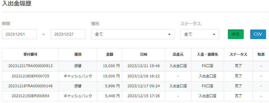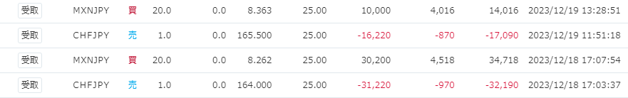 現在の鞘取り状況です。現時点で、ほぼトントンの状態です。スワップポイントのお陰で大幅な負けになっていません。もちろん、日中にはかなりの鞘が広がることもあります。逆に鞘が閉じて利益が出ていることもあります。どちらにせよ、淡々とポジションの推移を見守るだけです。 今後の予定 この後にどういうポジション取りをするのかは前回に書いたとおりになります。ひとまず利益確定に至るまで、MXN/JPYとCHF/JPYの状況を確認し、鞘が広がったところでエントリーします。また、別の鞘取りペアを見つけたら、またご報告します。 異業者鞘取りについて 。 異業者の鞘取りに関しては、通貨はもう決まっています。TRY/JPYです。買い……サクソバンク証券売り……みんなのFXこの通りに行こうと思っています。サクソバンク証券はTRY/JPYのスワップ最高値のことが非常に多く、一時的にスワップが大きくなることがあります。それに対してみんなのFXは、安定的に売りスワップが安いです。サクソバンク証券は、やや画面が見づらくほかの証券会社と比べて初心者には向かないのがやや難点ですが、それに比べてもメリットの方が多いと判断しました。 管理人おススメ! みんなのFX 管理人のおすすめ証券会社は「みんなのFX」です。MXN/JPYのスワップポイントが高く、定期的にキャンペーンを行ってくれる証券会社です。 実際のキャンペーンでのキャッシャバックです。5000円くらいのキャッシャバックは、スワップポイントが他社よりも安かった場合に、差額分を追加で還付してくれるサービスの対象額です。2か月くらいの間のMXN/JPYのスワップポイントでこの違いが発生するわけなので、かなりお得なサービスです。定期的に開催してくれるようなので、次回開催を心待ちにしています。15000円のキャッシャバックは、通貨の取引高に応じて一定額が還付されるサービスです。このキャッシャバックは、実は鞘取りとは別のトレードによるものです。一応鞘取り以外にも、裁量トレードを行っています。裁量なので求められることもないだろうと思うのですが、もし需要があるのなら裁量トレードの結果、ポジションなども公開していこうと思います。キャッシュバックされる通貨はGBP/JPY、GBP/USD、AUD/JPY、AUD/USDです。こういうキャンペーンはやる気につながるので、ドンドンやってほしいものです。 Follow me! @cpxmx729 FacebookXHatenaPocketCopy