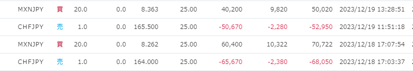 大荒れ相場が続く 正月明け、猛烈な相場が続いています。円高に振れるという大方の予想を覆し、現在は円安に振れています。140円割れも見えていた年初から一転、現在は145円を超えています。雇用統計の結果も21万人を超えて、大幅な円安に振れています。やはり予想通りにいかないのが相場というものですね。 現状のMXN/JPYとCHF/JPYの鞘取りペア状況 現時点での成績ですが、ほぼプラスマイナス0になりました。あれだけ大きく相場が動いていますが、このペアはそれほど影響を受けていないようです。以前の鞘が広がった状態から、ほぼトントンまで戻したことで、安定度の高さを証明できたのではないでしょうか。とはいえ、まだ雇用統計の影響が出たばかりです。今後どうなるのか、注視していくつもりです。 新しい仕掛け方の実践 今回、明確に円安方向に相場が触れました。そのため、新しい建玉を作ります。その際、今までは同時に建玉を作っていたのですが、今回は少し方法を変えます。MXN/JPYの買い玉を先に作り、CHF/JPYの売り玉は指値で建てます。MXN/JPYは8.571で建てました。CHF/JPYの指値は171.2です。もし指値が通れば、今までのペアよりもかなり優位性の高い建玉になります。鞘取りは安全性を重視するため、このようなギャンブル的な建て方は普段しないのですが、明確にトレンドが出た場合は、それに乗ることでローリターンからミドルリターンへと昇華させることになります。実は今までもそのような取引を何回か行ってきたことがあります。一応、今までの建玉は無事に利益確定に至っています。 ファンダメンタルズと地合いがマッチしていれば乗るのが重要 今回の雇用統計は、円高期待が高まっていた中でのサプライズ的な内容でした。そのため、波及効果はかなりありそうです。もちろん、確定というわけではありません。ですが、相場というものは往々にして勝負をかけるべき場面が来るものです。雇用統計のような重要なイベントではトレンドが長続きしたり、逆行するきっかけになったりするので、ファンダメンタルズと地合いがマッチしている状況では乗るべきと判断しました。このように、鞘取りでも大き目のリターンを回収することができるイベントが年に何度かあります。そこで、勝率高めのポジショニングをして、結果が出れば、良い結果が出やすくなります。次回以降、この建玉の行く末を掲載していく予定です。 みんなのFXで異通貨鞘取りを始めよう! くりっく365 スキャルピングならJFX証券 キャッシュバックも狙えるDMM証券 キャッシュバックも狙えるDMM証券 Follow me! @cpxmx729 FacebookXHatenaPocketCopy